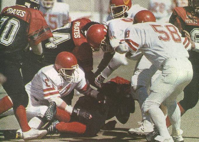 Falcons; played on astroturf; The Pirates were coached by Dave Anthony, a Canadian, who