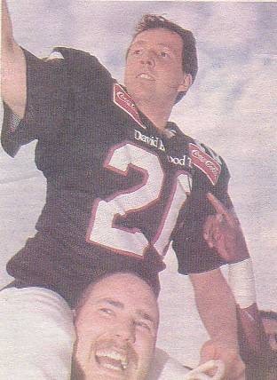 Webb being hoisted high by Greg Cross after his game winning field goal in the 1991 national final