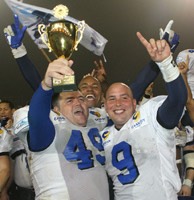 In an expanded Division Two, 20 sides took to the fields in highly competitive football. The Redditch Arrows and the West Coast Trojans went 10-0 in regular season, and eventually met in the semi-finals with the Trojans winning a thriller 38-30. Colchester Gladiators (8-2) won the Eastern Conference, the Oxford Saints (9-1) took the Western Conference and the Sussex Thunder (8-1-1) won the Southern Conference. In the other semi-final, the Saints thrashed the Sussex Thunder 33-0 to set up an eagerly awaited match-up with the Trojans. In a see-saw final, West Coast took a 28-22 lead on the back of Scott McMenemy’s interception return for a score, but with 48 seconds to go the Saints RB Chris Taylor (who rushed for 231 yards from 37 carries and 2 TDs) barreled his way in to tie the scores, and Newman sealed the championship for the Saints with the P