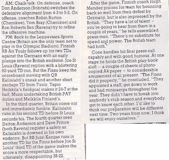Brett Lewis (Chelmsford) and Chaz Jasicki (Brighton B-52s) also got time in the passing position as Coach Tate experimented with his three QB's. But whatever the formation, the Brits could do no wrong. Lewis scored the fourth TD himself before half-time and then, as every British player got on the field, Mark Wynnick (Ravens), Steve Harvey (Birmingham), Mark Delaney (Ravens) and Allan Brown (Milton Keynes) all scored second half touchdowns. The final two scores were from passes from Lewis.