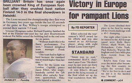 The other eight Lions selected for the All-Europe team were: Barry Driver, Mark Webb, Jo Richardson, Colin Nash, Paul Roberts, Warren Billingham, Gary Mills and Bola Ayiede.