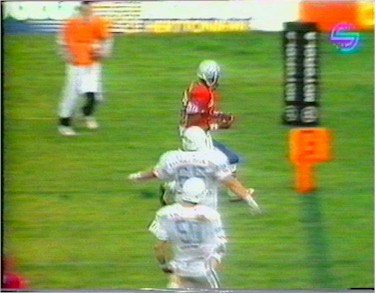 From then on defenses were the order of the day. Finland breaking the deadlock with a 32 yard field goal and it remained 7-3 until with sixty seconds to go in the game. Jason Elliot, having a stellar game, hit Bournemouth receiver Pat Millar for a 40 yard gain. Millar being dragged down a yard shy of the end zone.