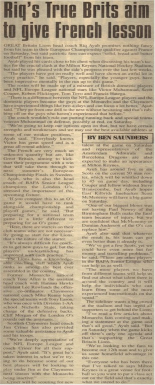 The only National match in 1998 was a European Nations qualifying match with the French in November at the Milton Keynes National Hockey Stadium. Great Britain had to win to qualify for the finals in Sweden in 1999. They did so comfortably, putting in one of the greatest Lions displays of alltime. The Brits were 16-0 up at half-time thanks to a Simon Newnham safety, a Bruce Reid 10 yard TD run, and Rowelle Blenham's 18 yard catch from QB Junior Price.