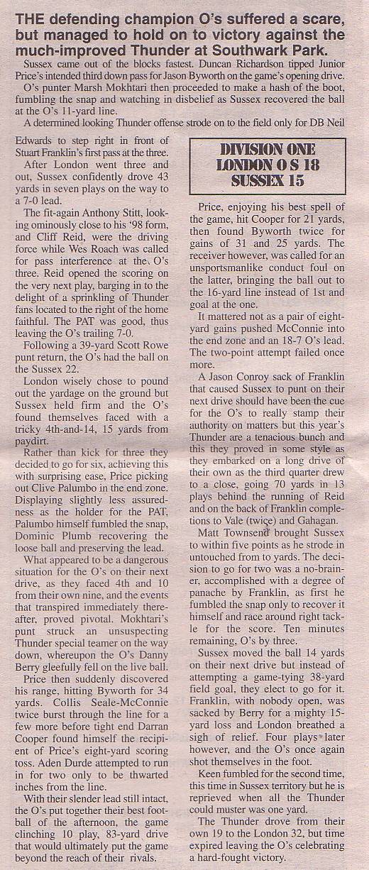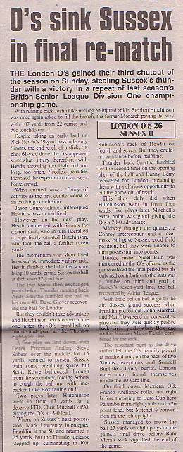 30th August - London O's 20-0 Sussex Thunder, BSL Div.1 Final. Report