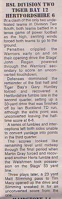 20th June - Tiger Bay Warriors 12-6 Hertfordshire Stags, BSL Division Two. Report