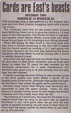 14th June - Norwich Devils 19-26 Ipswich Cardinals, BSL Division Two. Report