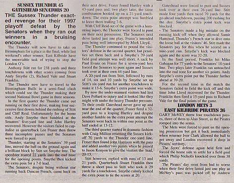 2nd August - Sussex Thunder 45-20 Gateshead Senators, BSL Division One Wild-Card. Report