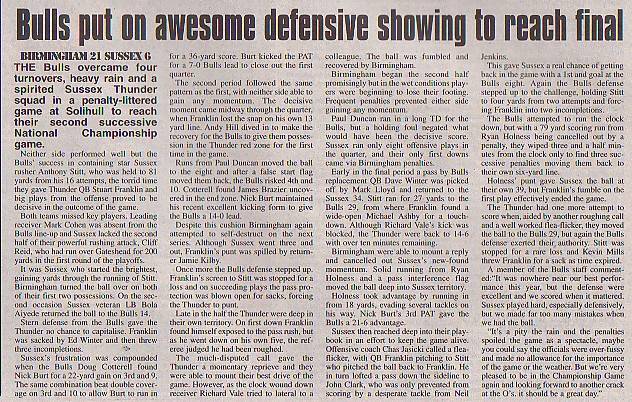16th August - Birmingham Bulls 21-6 Sussex Thunder, BSL Division One Semi-Final. Report
