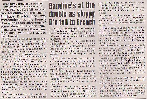29th April - London O's 0-22 La Courneurve Flash (France), EuroBowl Qualifier 1st leg. Report