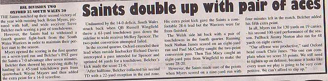6th May - Oxford Saints 35-20 South Wales Warriors, BSL Division Two. Report